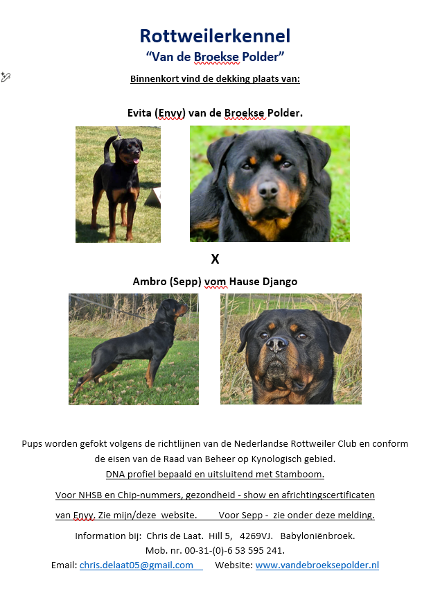 Binnenkort zal de dekking plaats vinden van Evita (Envy) van de Broekse Polder met Ambro (Sepp) vom Hause Django.