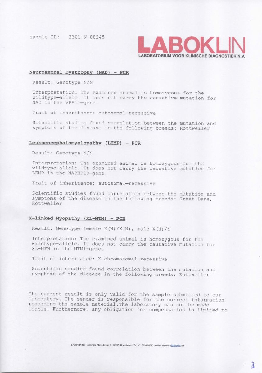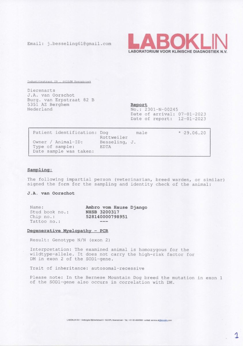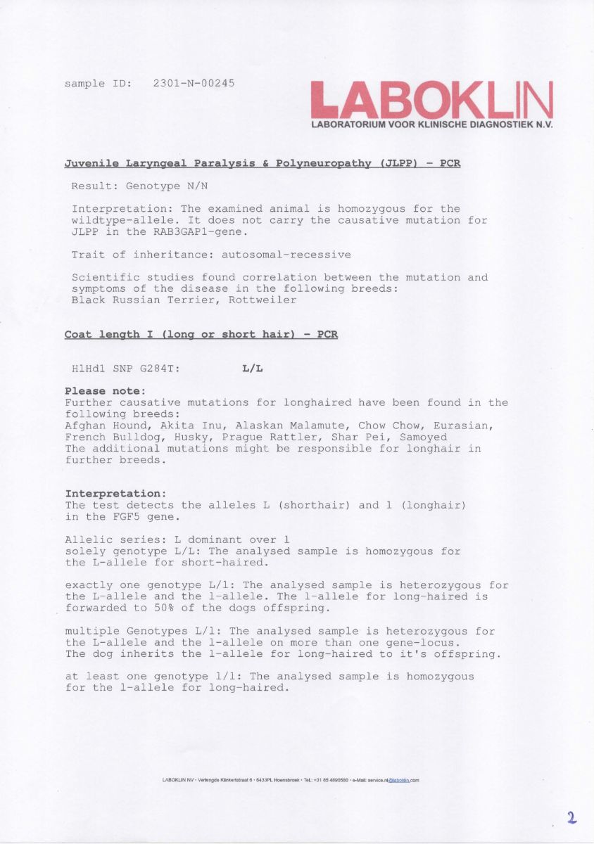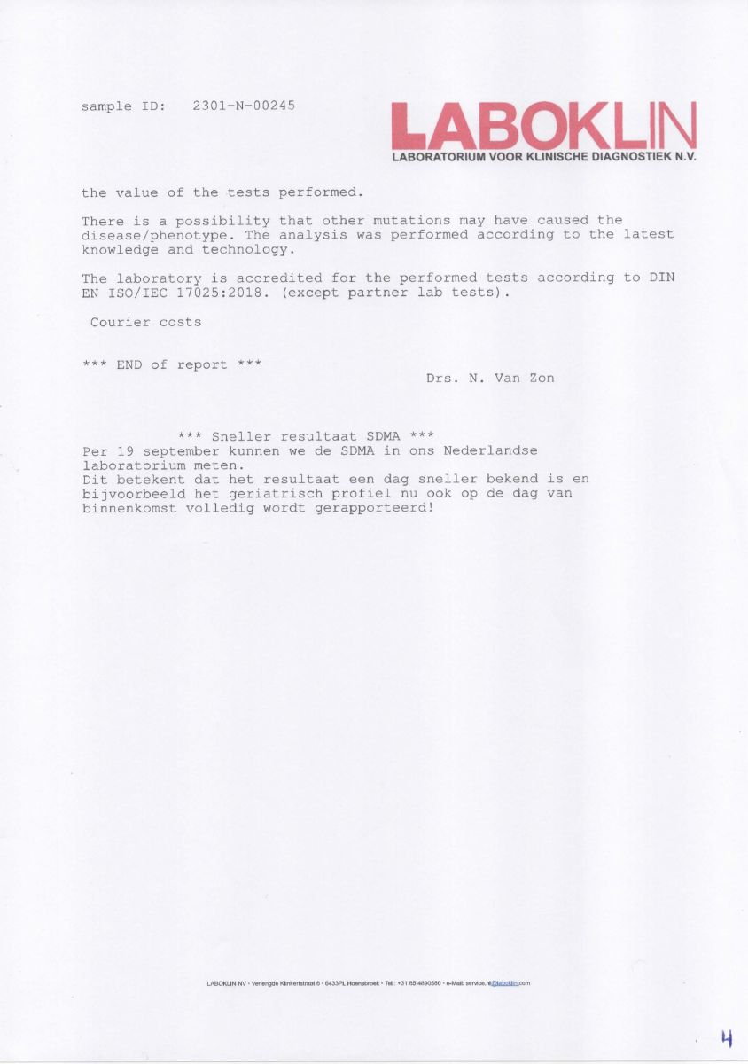 Laboklin rapport van Drs van Zon. No: 2301-N-00245. Rapport datum 12 januari 2023. (4 pagina's)