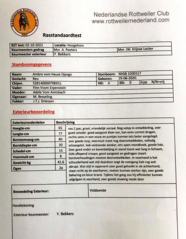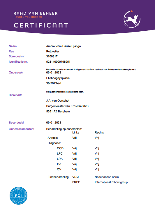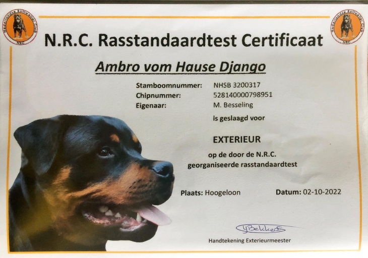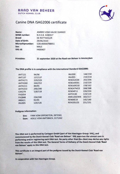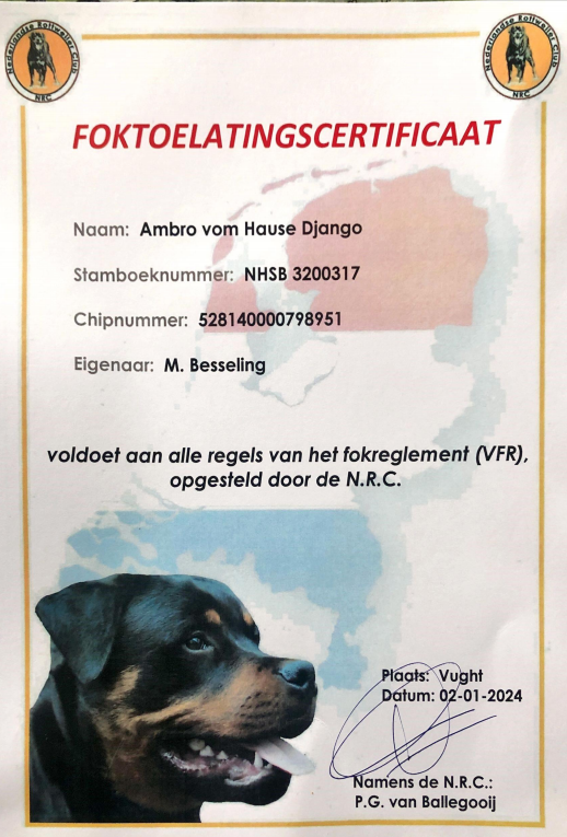 Ambro (Sepp) vom Hause Django. NHSB nr: 3200317. Chip nr: 528140000798951. Africhting: FCI-VZH/BH. FCI-IGP 3.